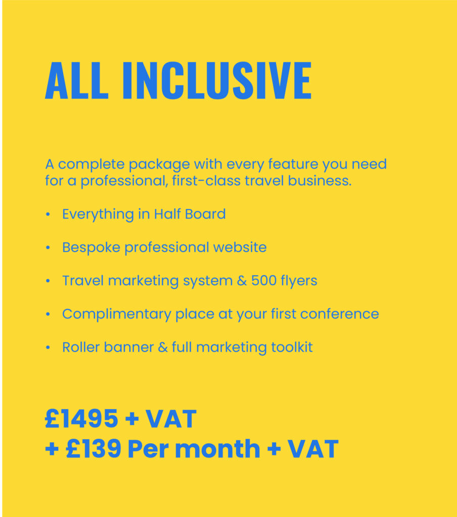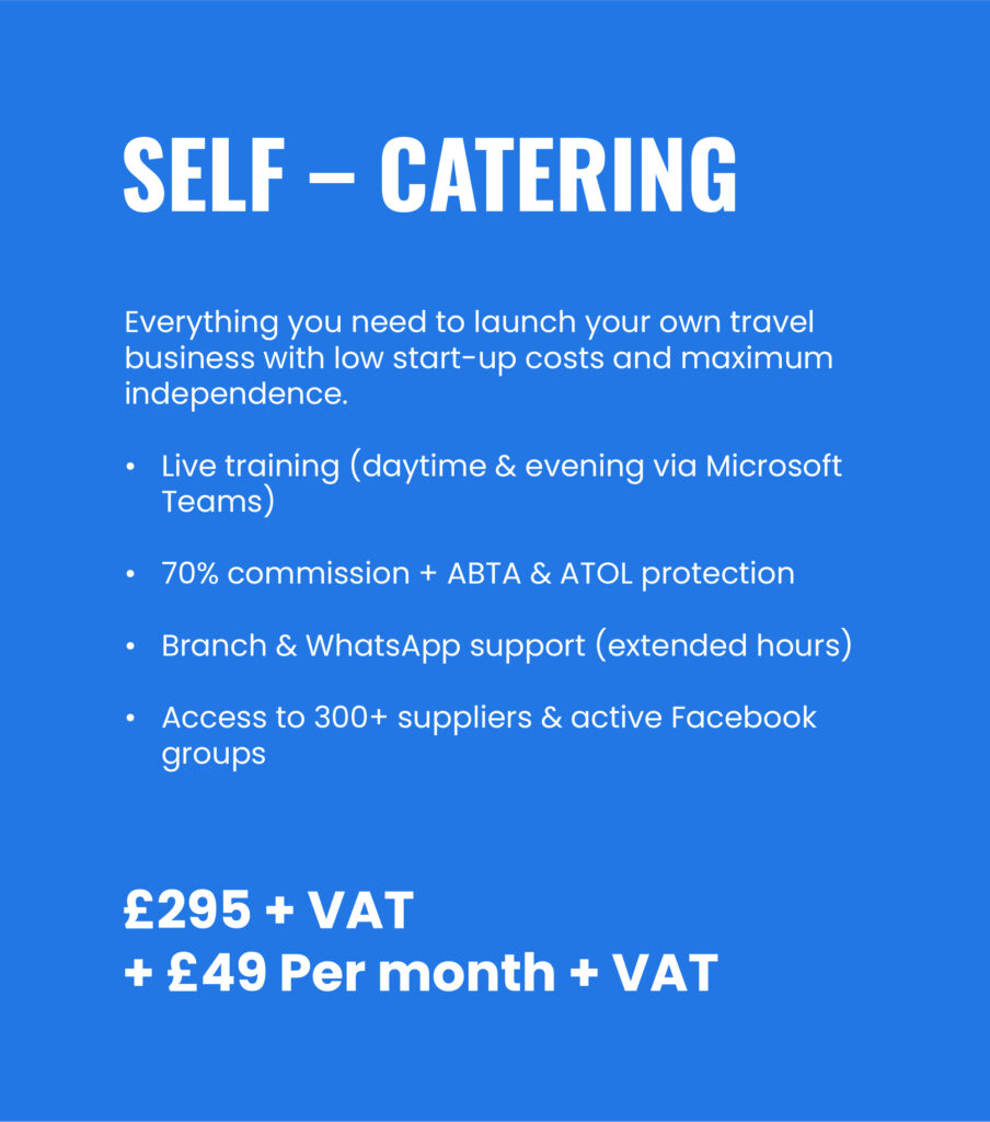 You can choose from three tailored sign-up packages, Self-Catering, Half Board, or All Inclusive to suit your budget and business ambitions. No prior experience is required, and live training gives you all the knowledge and confidence to start selling holidays from day one