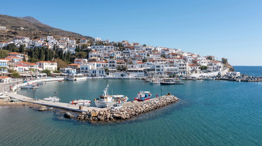 When it comes to beaches, Andros has sandy beaches and secluded coves and the charming resort of Batsi (pictured) serves as the ideal base with excellent dining options and a handful of bars to enjoy Greek hospitality.
